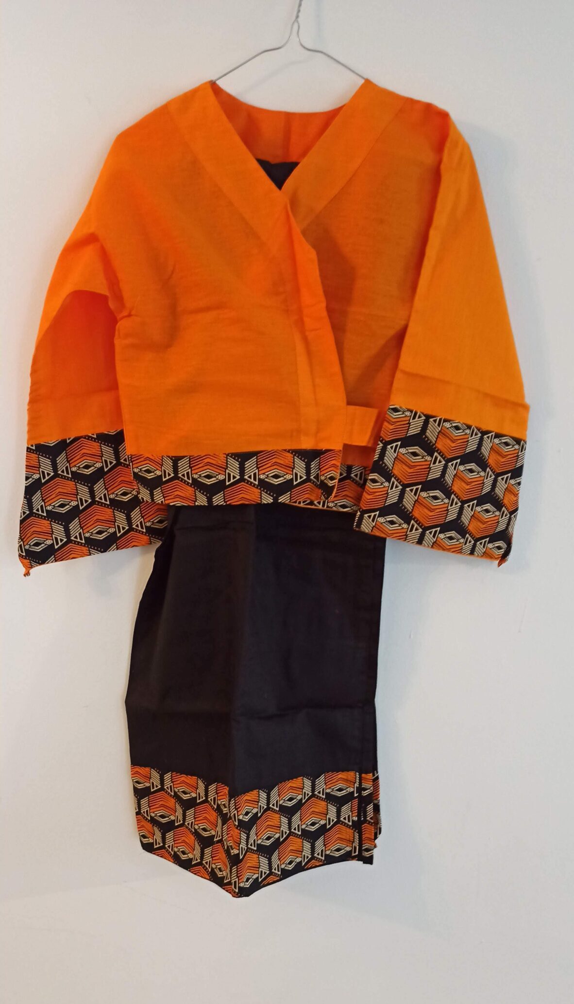 Completo kimono a maniche lunghe e pantaloni portafoglio in cotone monocromo con inserti in kitenge. Vestibilità regolabile, look elegante e comodo.