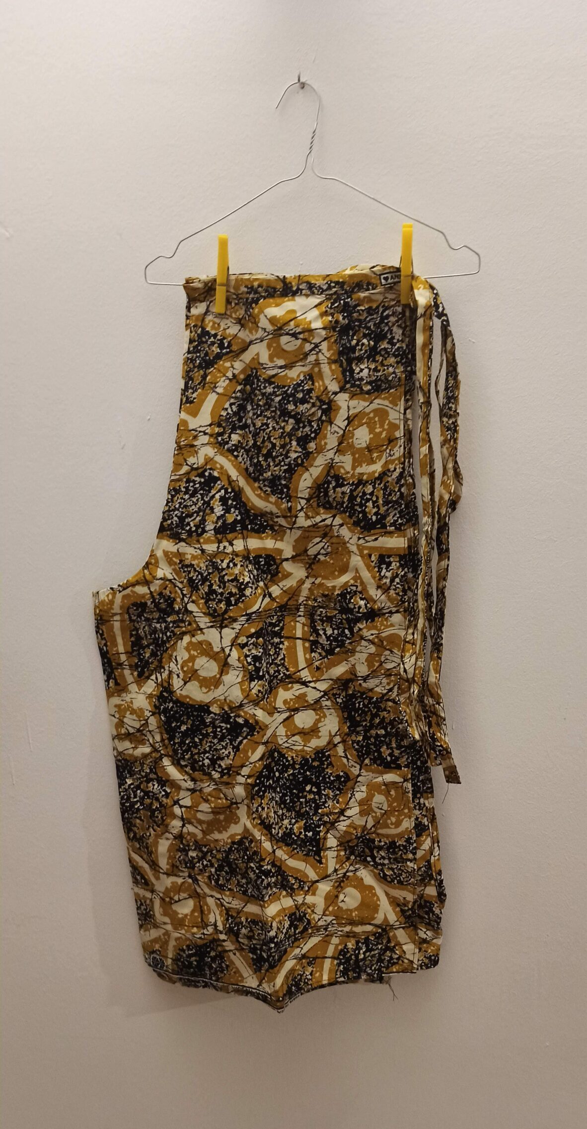 Pantaloni portafoglio gialli, lunghezza 95 cm, vita aggiustabile tramite chiusura.