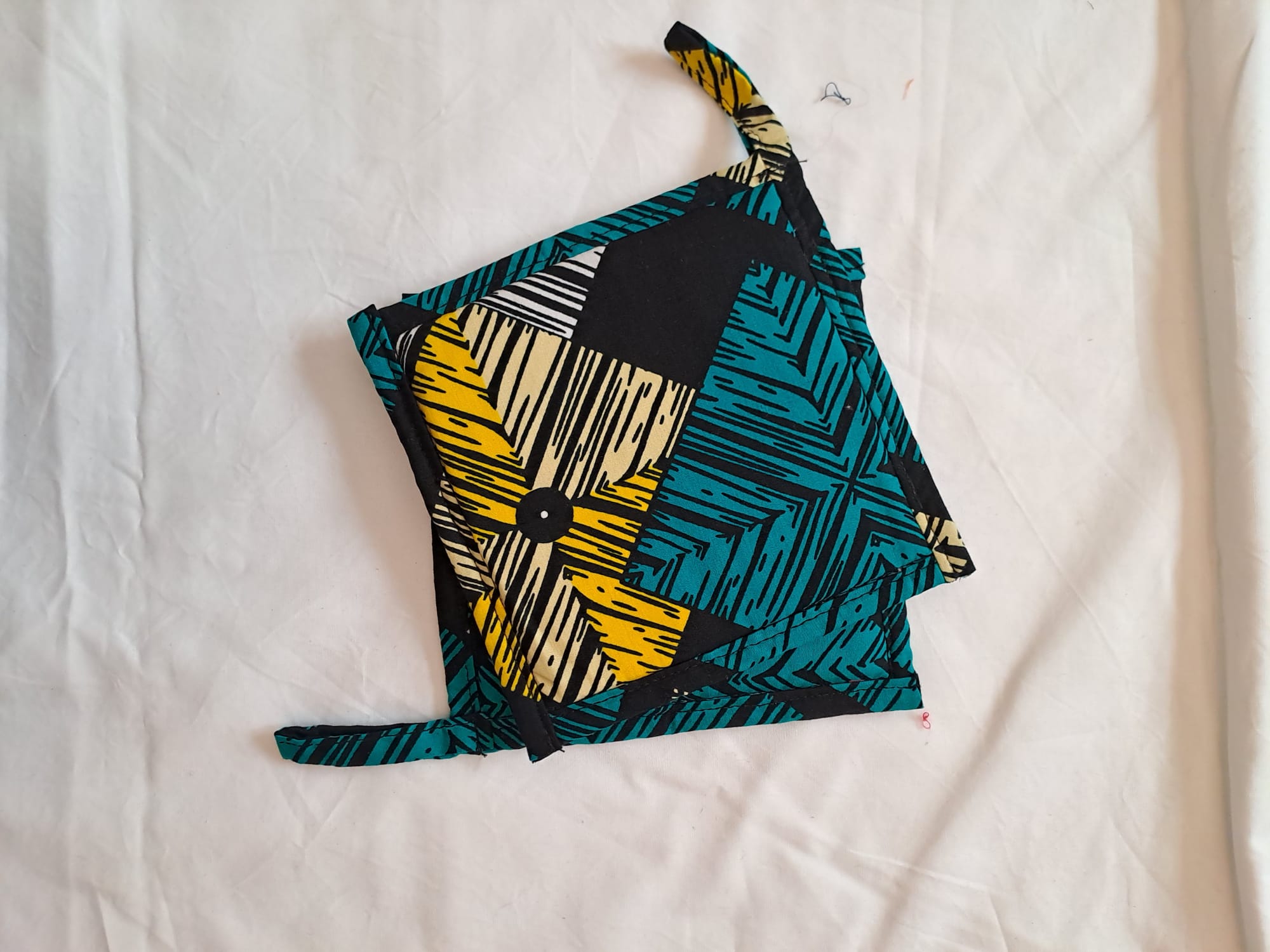 Presine da cucina imbottite in spugna, resistenti al calore. Disponibili anche in set coordinato con guanti e grembiule. Misure: 15 x 16 cm. Peso: 70g. Materiali: kitenge e spugna.