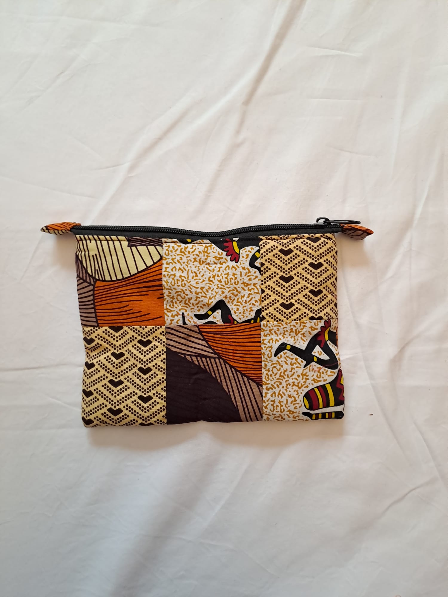 Pochette in patchwork, una borsetta di medie dimensioni con chiusura a zip, piccola e comoda da trasportare, tascabile, ideale per portare portafogli, trucchi ed altri accessori. Prodotto ecologico grazie alla scelta del patchwork che permette di riutilizzare tessuti di scarto dalle altre lavorazioni.