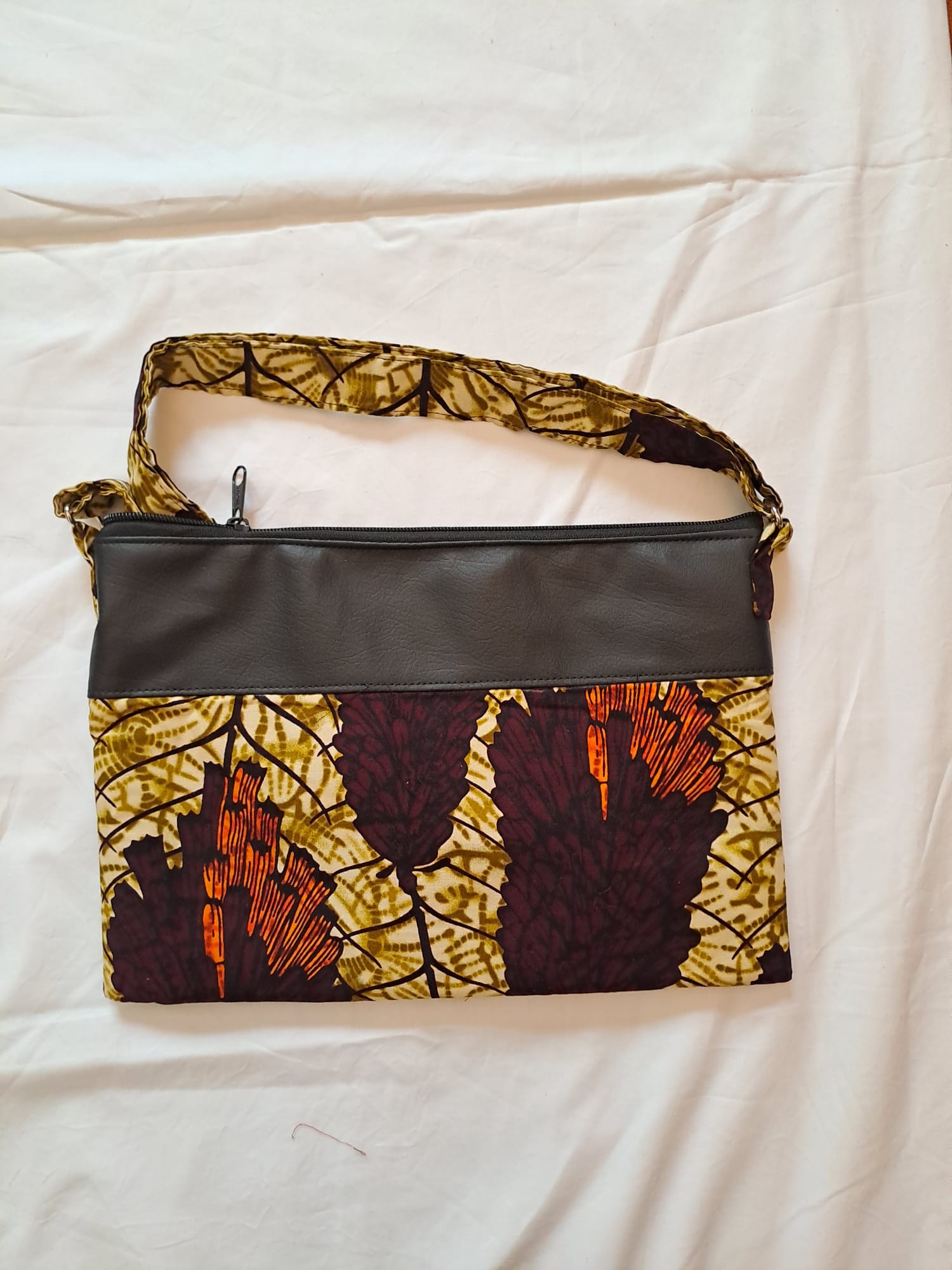 Borsa a tracolla in kitenge con dettagli in pelle e inserti imbottiti in spugna. Forma rettangolare morbida, confortevole e capiente. Misure: 33 x 22 cm. Peso: 165g. Materiali: kitenge, pelle, spugna, cotone.