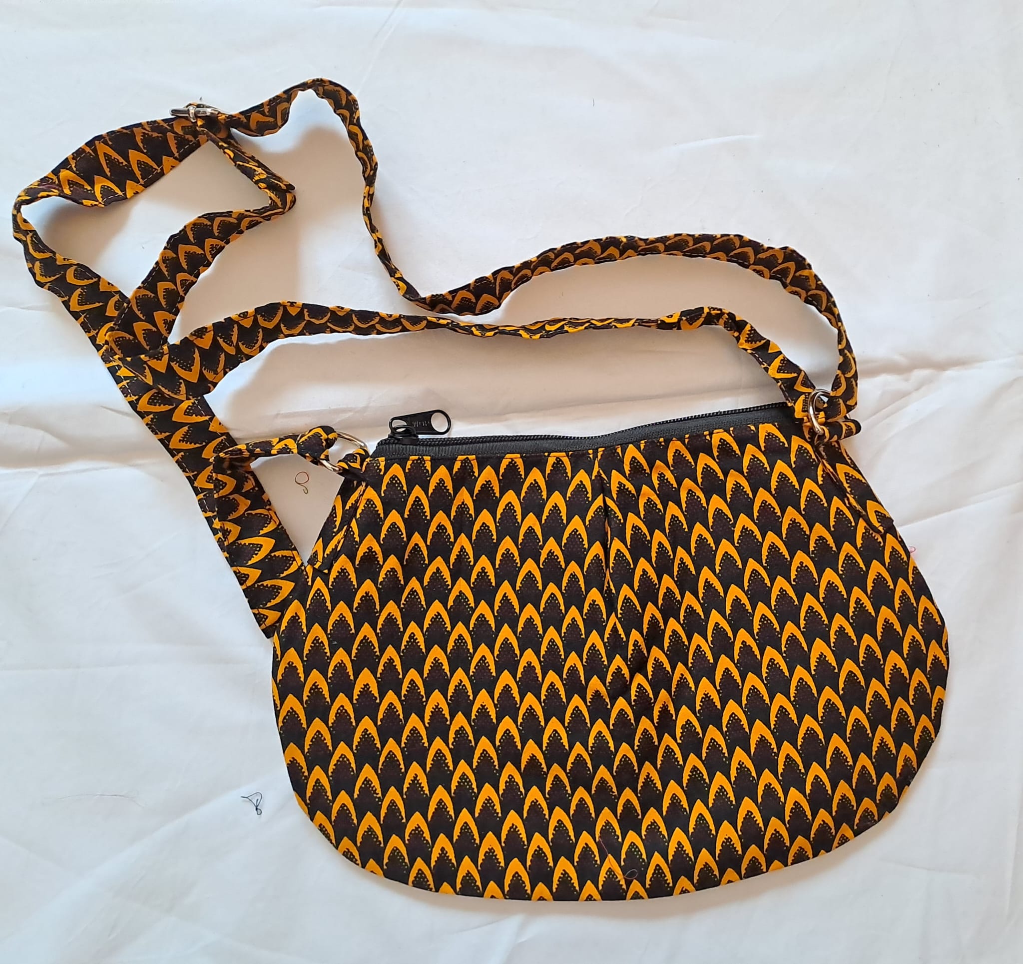 Borsetta a tracolla semirigida a forma di mezzaluna, realizzata in kitenge con fodera in cotone. Pratica, leggera e colorata. Misure: 28 x 18 cm. Peso: 100g. Materiali: kitenge e cotone.