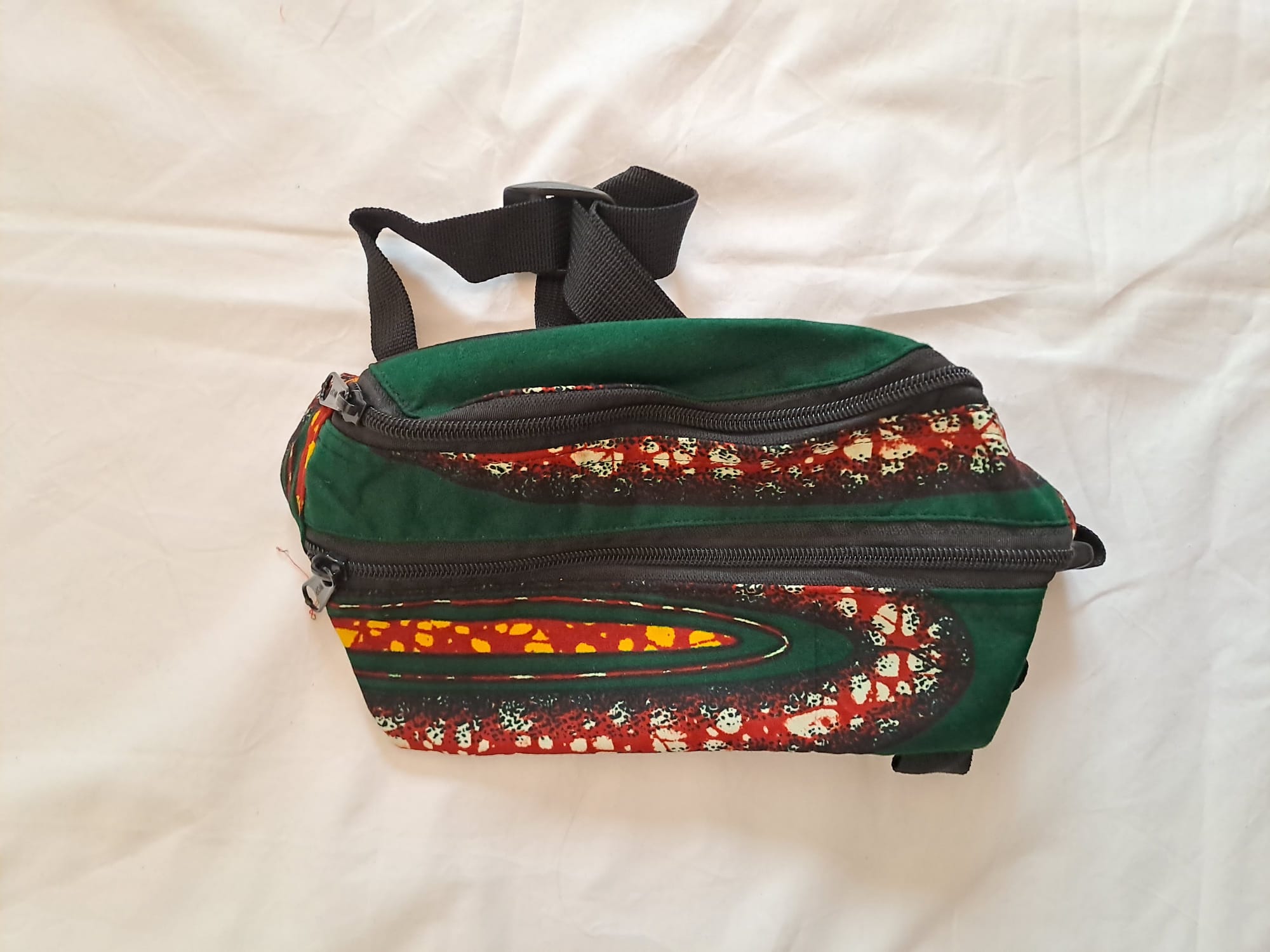 Marsupio regolabile in kitenge da allacciare in vita. Due scomparti per gli oggetti essenziali, pratico per tutti i giorni. Taglia unica. Peso: 70g. Materiali: kitenge.