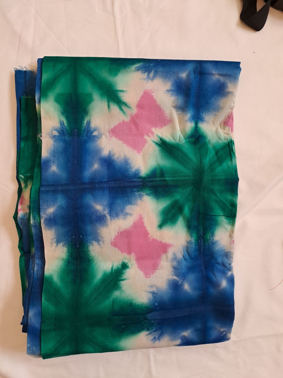 Tessuto batik Mkomanile realizzato con una lavorazione alternativa per ottenere disegni unici. Disponibile in 4 colori base (rosso, ocra, rosa, blu). Taglie/misure: S ~150×150 cm (300g) prezzo 12€; M ~300×150 cm (600g) prezzo 24€.